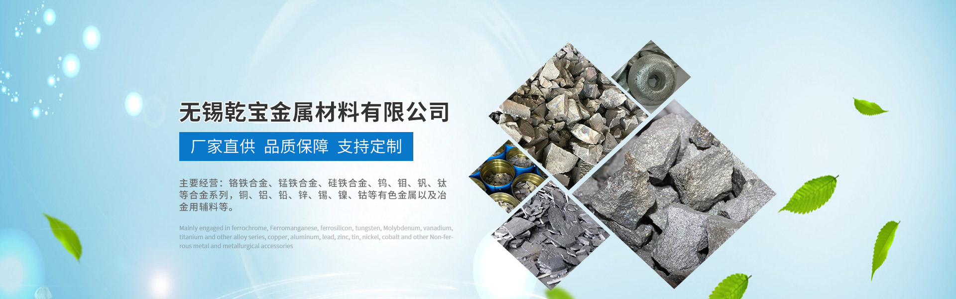主要經(jīng)營(yíng)鉻鐵合金、錳鐵合金、硅鐵合金、鎢、鉬、釩、鈦等合金系列, 銅、鋁、鉛、鋅、錫、鎳、鈷等有色金屬以及冶金用輔料等